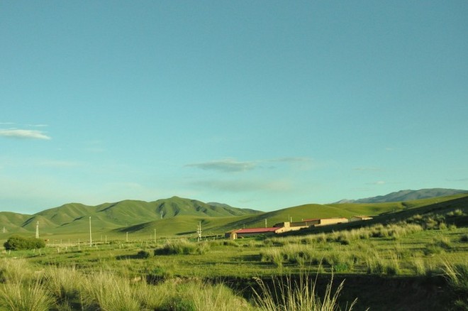 大概下午五点的时候,我掉队了,连捡漏领队都不见了踪影,看着仍然是一望无际的青藏国道,回首很久都看不到队友的身影,又渴又累的我在这个路口停下稍作休息,在骑的时候总是一鼓作气的埋头向前冲,顾不上身体上的感受,停下来后才发现腰和屁股都像被针扎的刺痛,望着这条通往青海湖的小路,突然间我的情绪就频临崩溃了。当时的绝望无肋感到现在时隔几个月重写游记都依然深刻,我觉得我的意志在身体的疼痛面前全部溃败了(旅行回来后我的腰就一直痛,去医院检查才得知我有腰间盘突出,医生说我骑行那么长的时间对我的腰是毁灭性的伤害)剩下的十几公里我是肯定无法再骑了(当天的骑行公里为92,我当时骑了差不多八十公里),看着手机仅剩的一格电量,我赶紧打电话给领队让他安排救援车辆来载我,电话里得知救援车已快到了目的地二郎剑,要先把车上的人员拉到酒店才能返回接我,而领队又离我有几公里之远,没办法,唯有叫我继续往前骑,他在前面等我,为了纪念那一刻沮丧的我,让一个路过的美女帮我拍了上面这张照片作纪念。