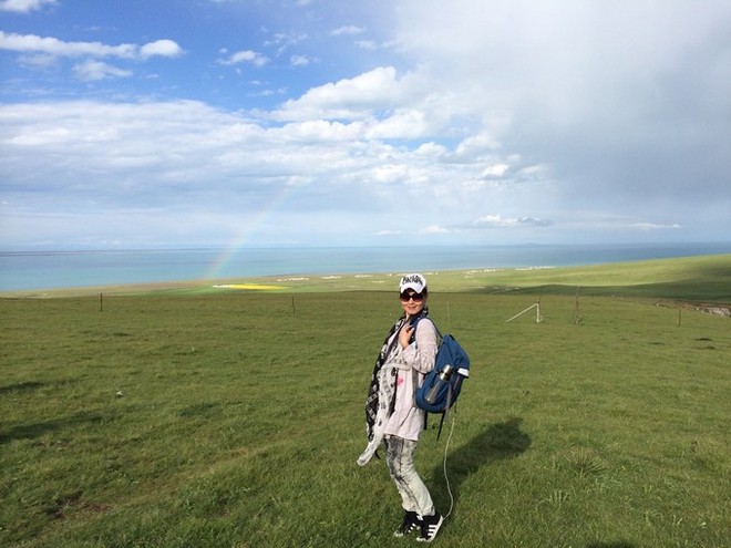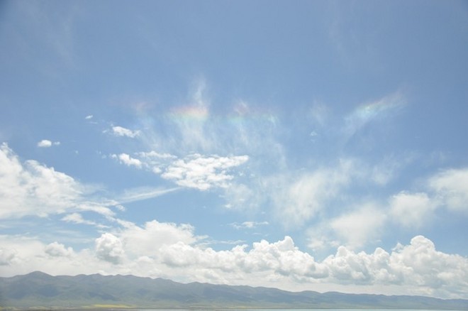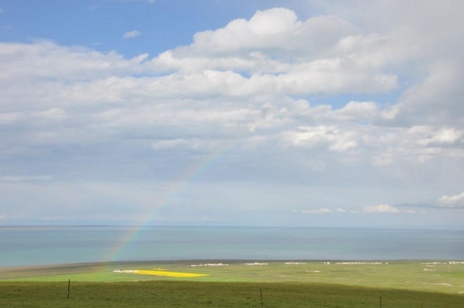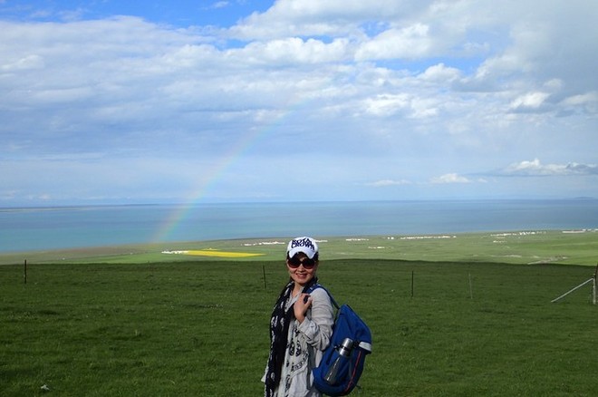 真是人品大爆发,刚到达山顶就出彩虹了,雨后的彩虹就像一座七彩的拱桥架在青海湖面上,好美啊!每个人都拿着相机“咔咔咔”地对着彩虹拍照,一张张绚丽多彩的照片在接连不断的快门声中诞生了,成为我永久的、美好的回忆!彩虹是美丽的,她的美丽经历了暴风雨的洗礼,来之不易。我的游记写得也很不容易,各位看官请留下你的脚印