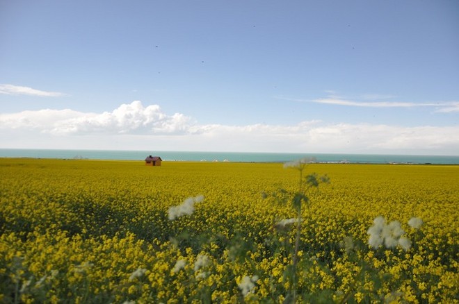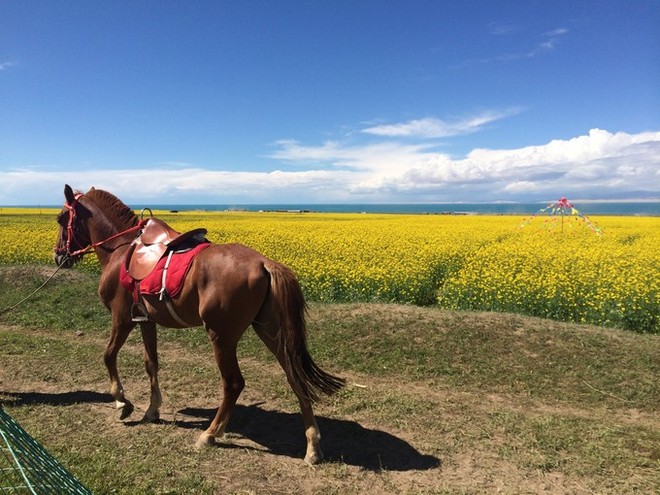 下午三点左右行至青海东线最美观景路段,一幅幅童话般的画景跃入眼帘,经典的红木房子、风车木屋、七色经幡、帅气的骏马、高颜值的藏羊把波澜壮阔的金黄花海铺衬得如翊如生,在青海湖面前,用任何华丽的语言形容都会显得苍白无力,原谅秀才也词穷。