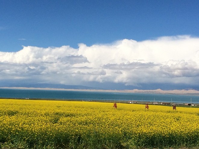 第二天早上八点吃完早餐后,我们整装待发,音乐响起,拍了一张酷酷的合影,但现在却怎么都找不到合照的相片了,还好最后一天还有个大合照。完了我们一行三十多人就浩浩荡荡的踏上骑行之旅,车队穿越在广袤的金银滩大草原,与牛羊并肩前行,途经金沙湾后,可以远瞰到青海湖似从天边而来,路过湖东沙漠,车队转向青藏公路,不一会就到达了青海湖油菜花盛开的地方,这里山,水,草原,花海融为一体,让人心醉。