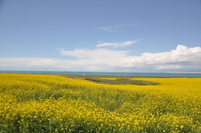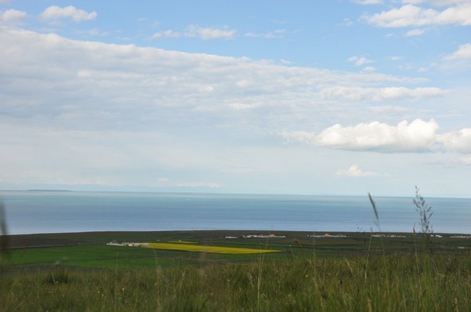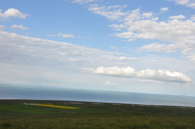 穿过金黄的油菜花海丘陵带迎来了美丽的青海湖。湛蓝的天空、棉花般的云朵、翠绿的草地、澄净如镜的湖泊像一条织好的画卷沿着我滚动的车轮在前行中一路展开在我的眼前,一路欢呼一路惊喜!