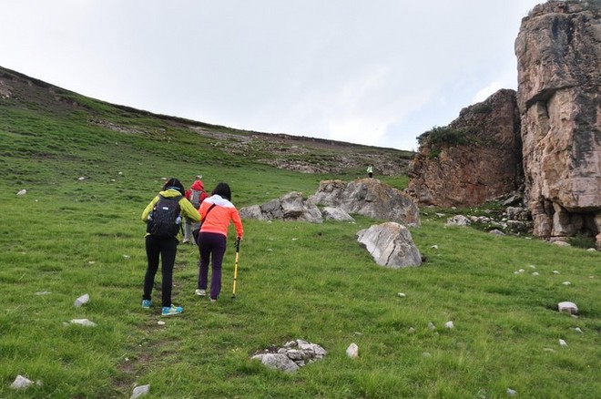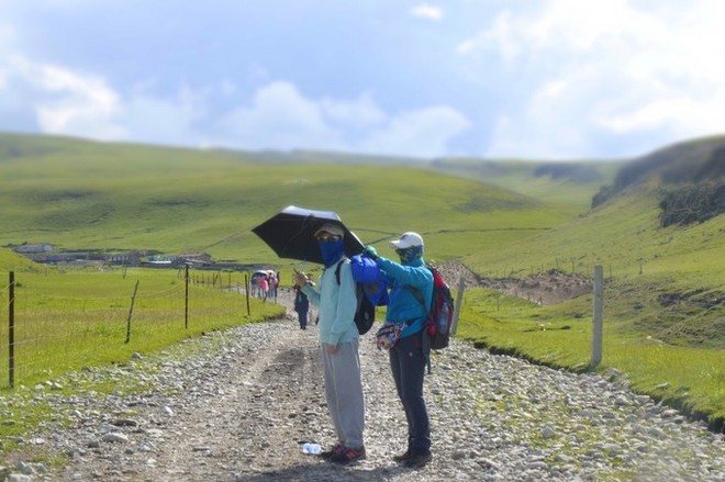 拍完照片我们开始下山了,雨虽然停了,但有些队友仍披着雨衣挡风,我从山上往下拍他们这道美丽的风景。