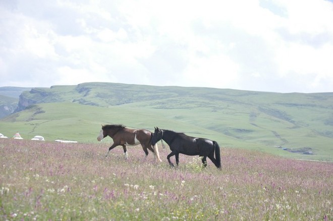 正当沉醉在花草世界的时候突然有两匹奔驰的骏马闯入我的镜头里,黑得发亮的毛发远远的都亮瞎我的眼,更不要命的是竟然在如此美丽的花草丛中奔跑起来了,我仿佛置身于电视里的纪录大片般,惊喜雀跃得朝着他们飞奔的方向狂追。