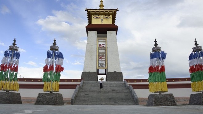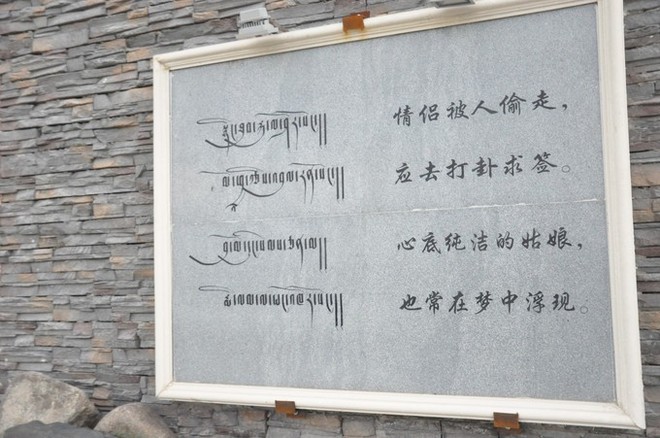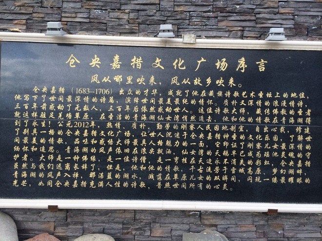 从去完茶卡盐湖后我们就到刚察吃午饭,完了出发去新建的仓央嘉措广场,广场是在刚察县城最东面,占地不大,中心竖着一面记念墙,中间刻有第六世达赖喇嘛仓央嘉措像,两边的大理石墙面上刻仓央嘉措写的诗。广场上再摆放一些大小不一的石头,上面刻些民族符号。