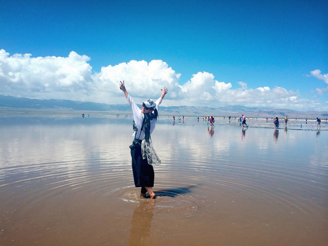 我所到之处都是人烟稀少的位置,好不容易逮到两个正在拍照的女生,请求她们用手机为我拍了几张,一阵疯狂摆POSE,过后回看感觉张张都是大片,只可惜手机拍的太糊了,也好,留点遗憾下次再来,我和茶卡有个约定,下次带上我的御用摄影师