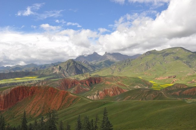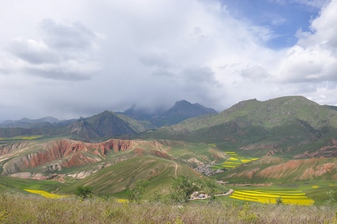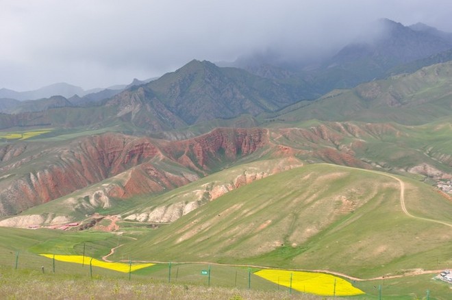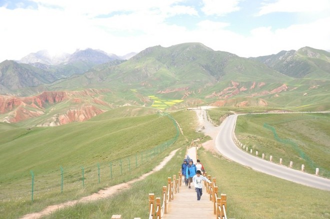 卓尔山是出大片的地方,视野开阔,美景一览无余,发烧友们在这里拍到过唯美的“丁达尔现象”当然这还得拼人品。我们徒步登上了卓尔山观景台(景区停车场有上到半山腰的游览大巴),眺望红色的丹霞山脉,铺天盖地的绿色,间杂着整齐的黄菜花,山腰间白云缠绕,高大的佛塔在远处的白云间飘忽,刹那地震撼,无语,在大美的卓尔山面前。