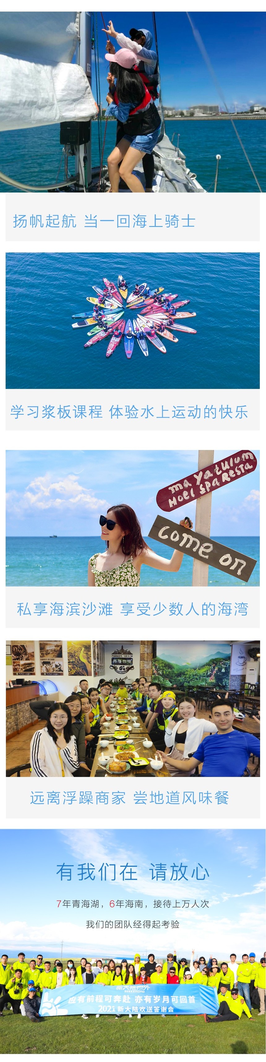 早上前往博鳌,在博鳌风景如画的乡村中领取自行车,学习基础骑行技巧,然后沿着红树林,椰林槟榔林等构成的乡村绿道,骑行去有着天堂小镇之称的博鳌,吹吹海风,品品琼海的正宗清补凉,之后返回三亚,乘坐帆船出海,感受南海碧波,水上活动结束后,在三亚市区游轮码头解散,结束我们的四日之旅~
