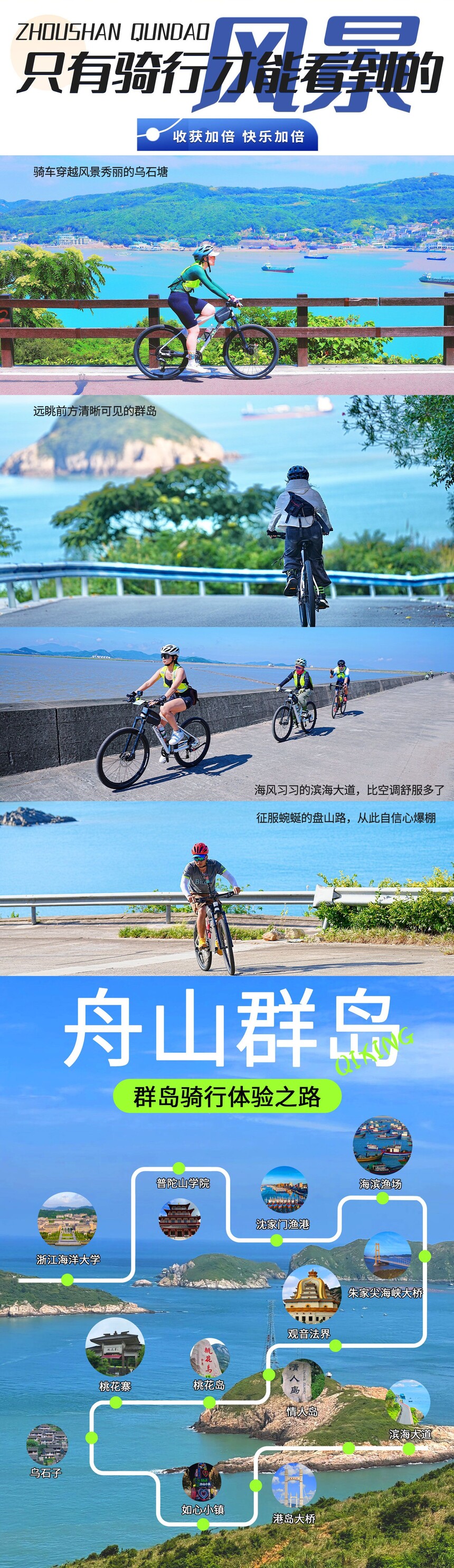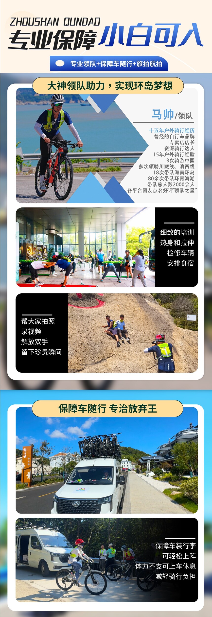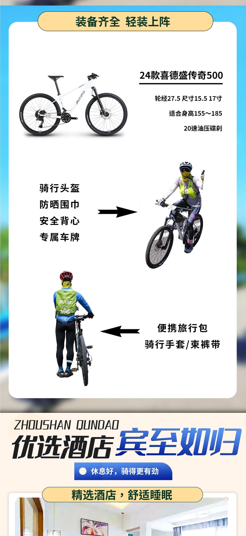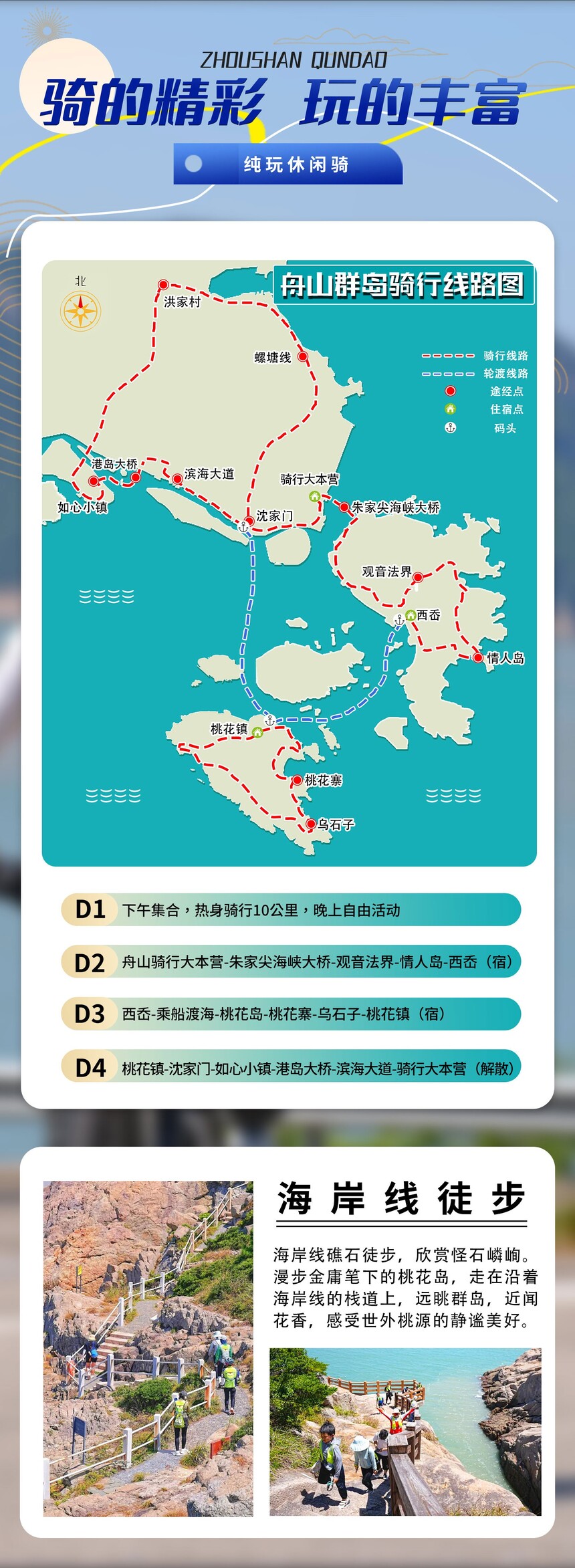 错峰出游:只要1780元 10月9日、10月13日 10月17日、10月21日 10月25日、10月29日 11月2日、11月6日 11月10日、11月14日 11月18日、11月22日、11月26日 心动了?快联系客服 行程速览 D1:下午集合,热身骑行5公里,晚上舟山市新城区自由活动 下午4点酒店大厅集合,骑行热身教学,沿滨海公园和莲花岛雕塑公园进行5公里试骑行。领队注意事项讲解,行前破冰。晚上入住酒店后大家可以自由活动,寻觅美食。 D2:舟山骑行大本营-朱家尖海峡大桥-观音法界-情人岛-西岙(宿),骑行40公里 横跨海峡大桥,路过普陀学院,观音法界等地标建筑,之后骑行线路朱家尖风景名胜区及背面的樟州湾、大乌石塘和南面的小乌石塘、东沙、南沙,情人岛等一流海景休闲观光带。下午进入天门山—情人岛进行环岛徒步,一堵海侵地貌的震撼,晚住海岸民宿,赏析日出日落。 D3:西岙-乘船渡海-桃花岛-桃花寨-乌石子-桃花镇(宿),骑行40公里 乘摆渡船到达金庸笔下桃花岛,桃花岛是金庸笔下东邪黄药师的居住地,孕育了侠义和浪漫相得益彰的本色。沿着海岸线环岛骑行,中间游览桃花寨景区,徒步海岸线,感受世外桃源般的静谧。下午沿着桃花岛中间的山脉骑行,开启一段充满挑战的盘山公路之旅,感受轮征山海的魅力,晚上宿桃花岛。 D4:桃花镇-沈家门-如心小镇-港岛大桥(解散结营),骑行55公里 早上桃花岛乘摆渡船到达舟山本岛 从世界级海港沈家门出发,一路骑行鸭东线,横穿本岛,再经过跨海大桥到达如心小镇,在如心公园和跨海桥旁的网红咖啡店小憩,之后再顺着港岛大桥和滨海大道一路骑行,完成环岛壮举,16点左右举行结营仪式,颁发骑行证书,行程解散。