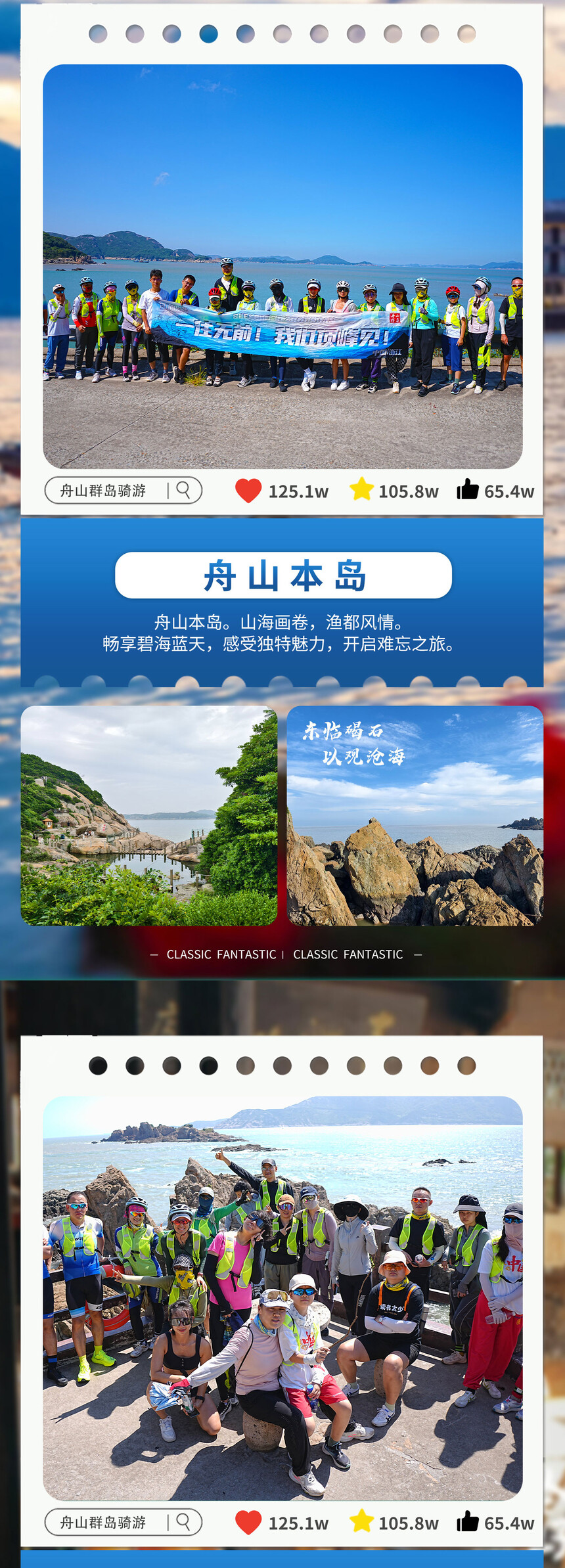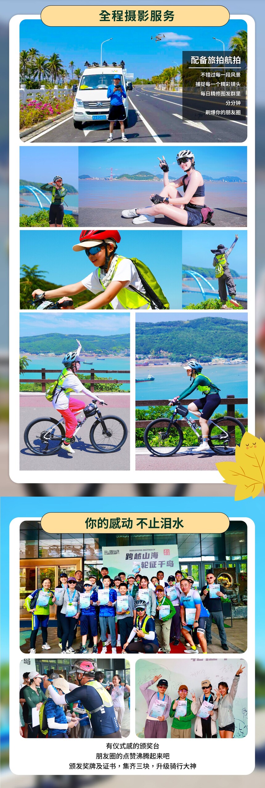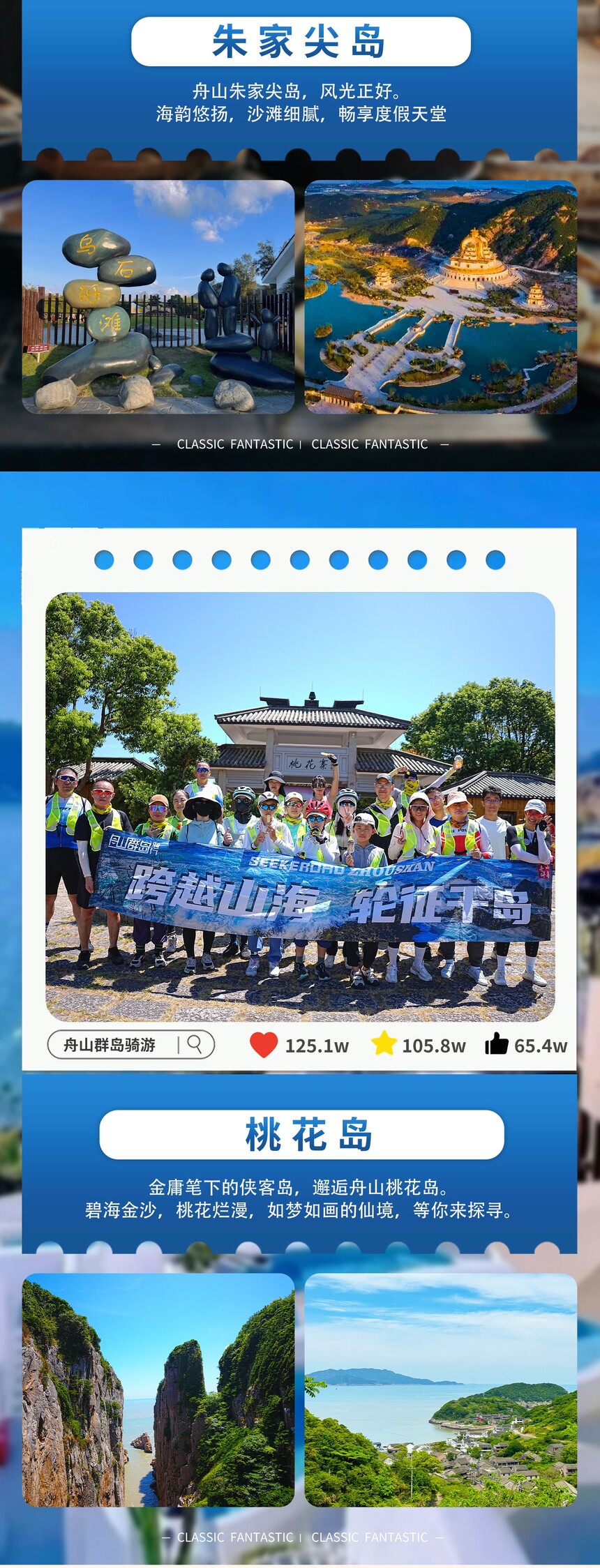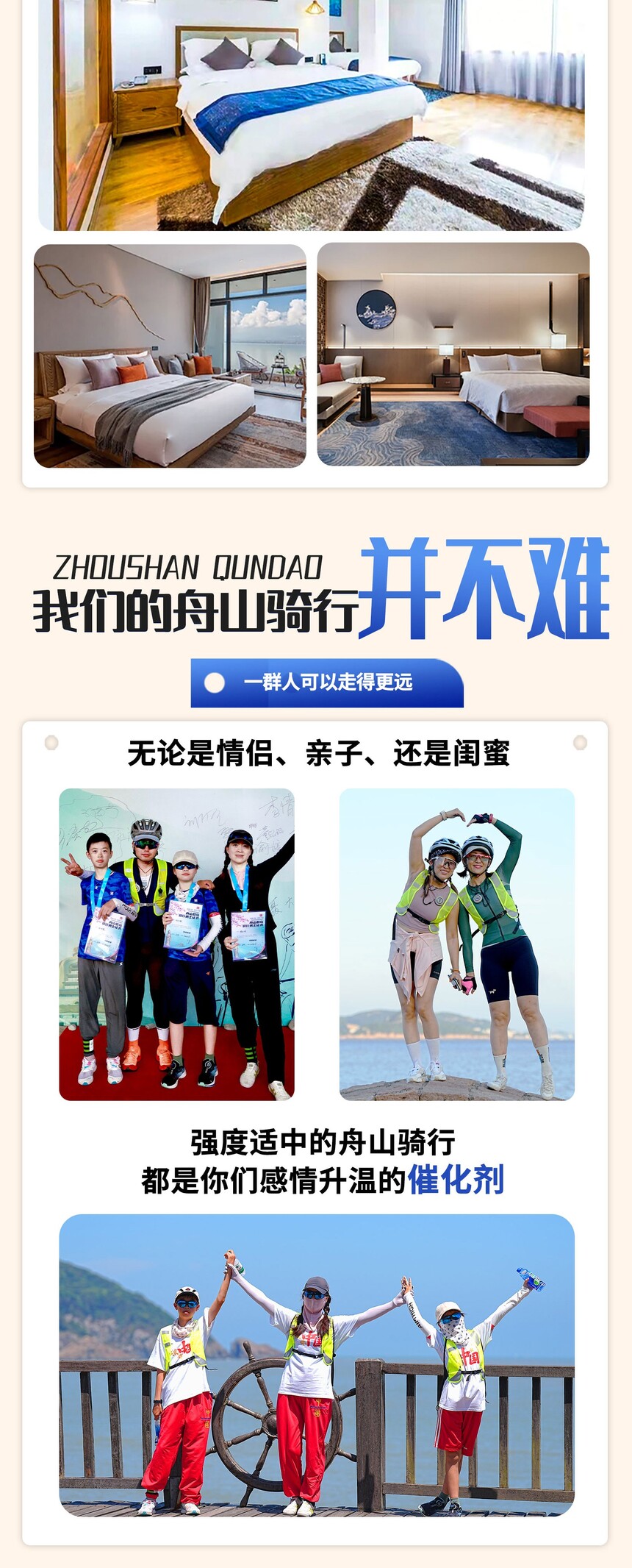 错峰出游:只要1780元 10月9日、10月13日 10月17日、10月21日 10月25日、10月29日 11月2日、11月6日 11月10日、11月14日 11月18日、11月22日、11月26日 心动了?快联系客服 行程速览 D1:下午集合,热身骑行5公里,晚上舟山市新城区自由活动 下午4点酒店大厅集合,骑行热身教学,沿滨海公园和莲花岛雕塑公园进行5公里试骑行。领队注意事项讲解,行前破冰。晚上入住酒店后大家可以自由活动,寻觅美食。 D2:舟山骑行大本营-朱家尖海峡大桥-观音法界-情人岛-西岙(宿),骑行40公里 横跨海峡大桥,路过普陀学院,观音法界等地标建筑,之后骑行线路朱家尖风景名胜区及背面的樟州湾、大乌石塘和南面的小乌石塘、东沙、南沙,情人岛等一流海景休闲观光带。下午进入天门山—情人岛进行环岛徒步,一堵海侵地貌的震撼,晚住海岸民宿,赏析日出日落。 D3:西岙-乘船渡海-桃花岛-桃花寨-乌石子-桃花镇(宿),骑行40公里 乘摆渡船到达金庸笔下桃花岛,桃花岛是金庸笔下东邪黄药师的居住地,孕育了侠义和浪漫相得益彰的本色。沿着海岸线环岛骑行,中间游览桃花寨景区,徒步海岸线,感受世外桃源般的静谧。下午沿着桃花岛中间的山脉骑行,开启一段充满挑战的盘山公路之旅,感受轮征山海的魅力,晚上宿桃花岛。 D4:桃花镇-沈家门-如心小镇-港岛大桥(解散结营),骑行55公里 早上桃花岛乘摆渡船到达舟山本岛 从世界级海港沈家门出发,一路骑行鸭东线,横穿本岛,再经过跨海大桥到达如心小镇,在如心公园和跨海桥旁的网红咖啡店小憩,之后再顺着港岛大桥和滨海大道一路骑行,完成环岛壮举,16点左右举行结营仪式,颁发骑行证书,行程解散。